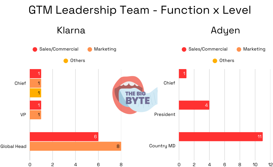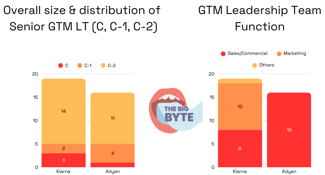 This comparison points to slightly higher efficiency at Klarna’s top GTM tiers. However, the broader context is that Klarna’s leadership team has a strong marketing emphasis, while Adyen’s leadership team is oriented toward enterprise sales.