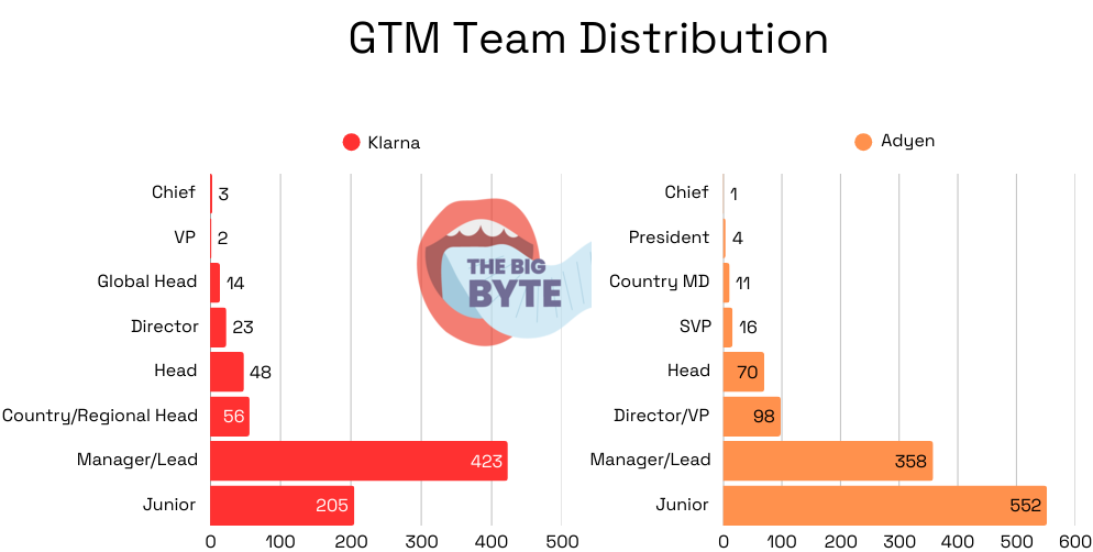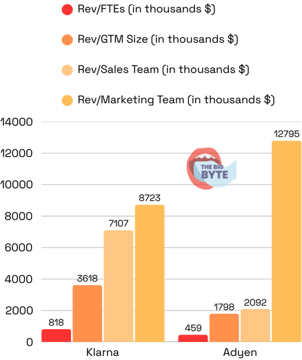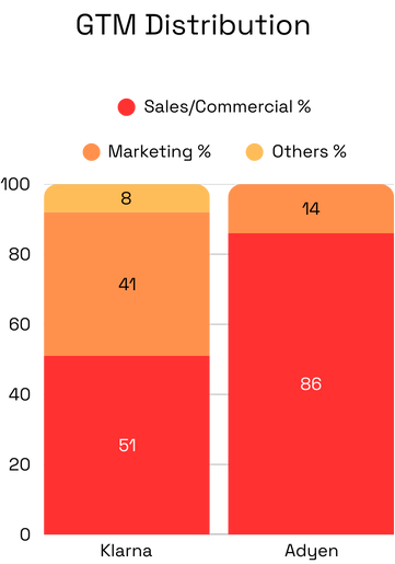 GTM size: 774 FTEs for Klarna vs. 1110 FTEs for Adyen