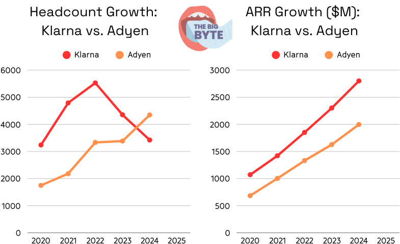 Klarna (2022-2024): -21.31% annual FTE growth rate & 23% annual ARR growth rate