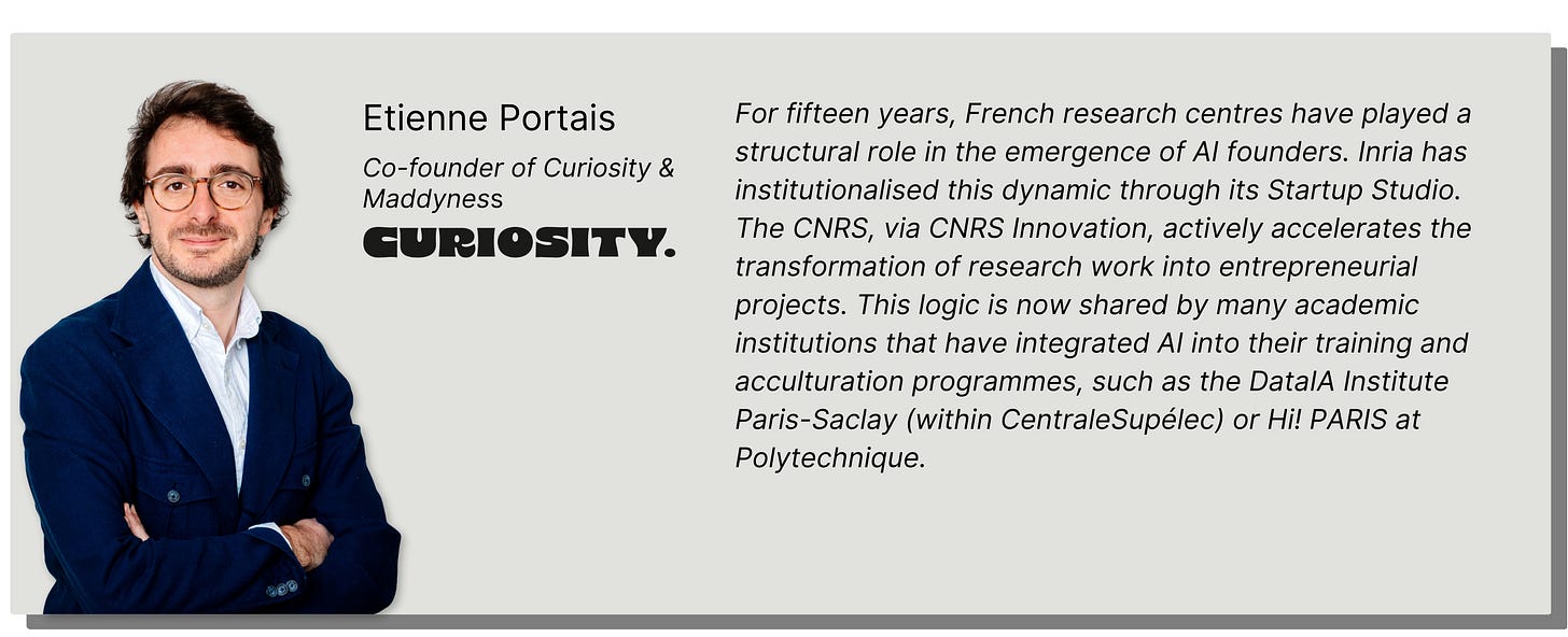 Once again, a public institute leads the ranking. CNRS stands out as the most efficient founder pipeline. Inserm also appears in the top 5, which shows that health research is becoming a strong AI feeder. Among major French AI unicorns, Owkin and Dental Monitoring both operate in the Healthtech and Biotech space.