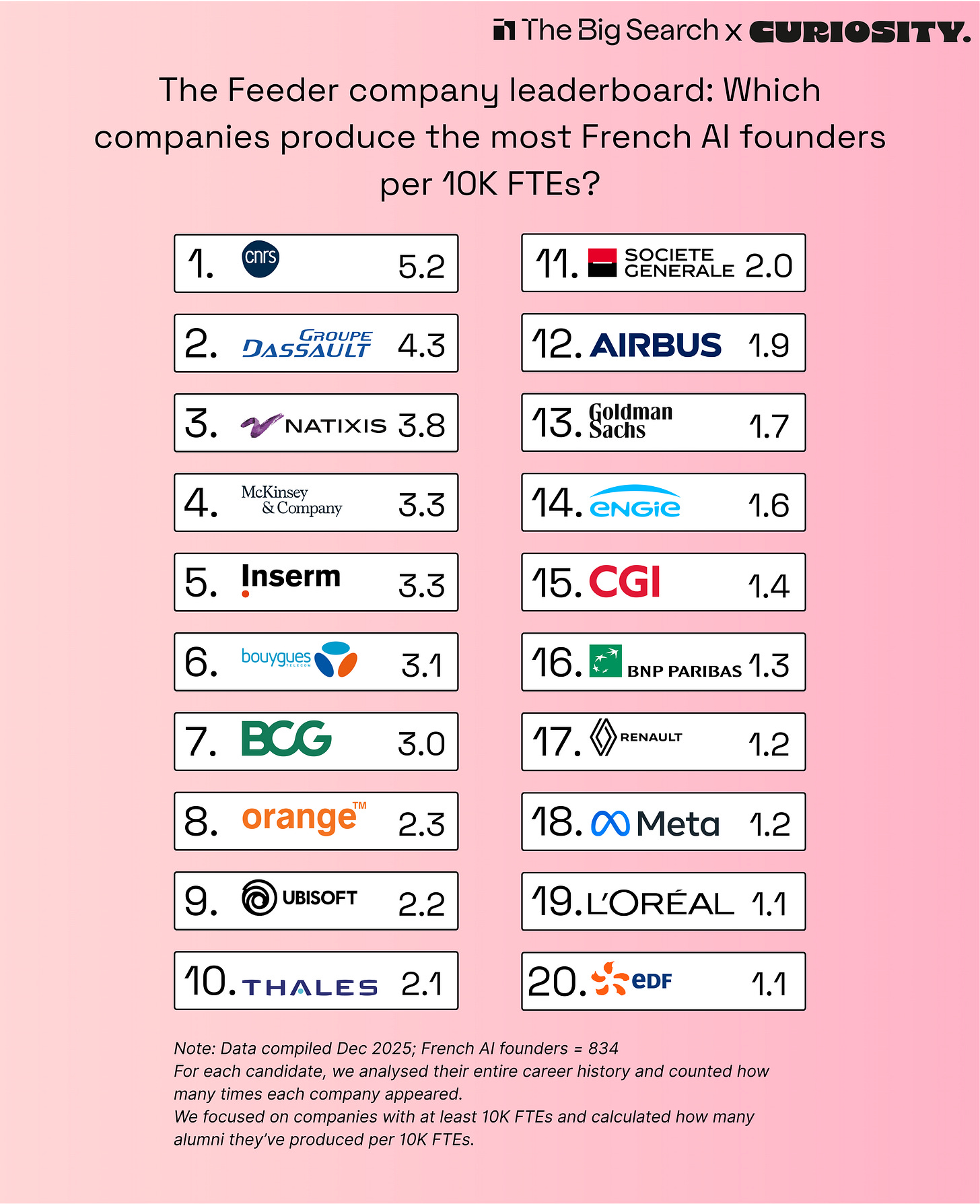Next, we looked beyond volume and measured the relative efficiency of feeder companies. We focused on organisations with at least 10K FTEs and 5 alumni and calculated how many French AI founders they’ve produced per 10K FTEs.