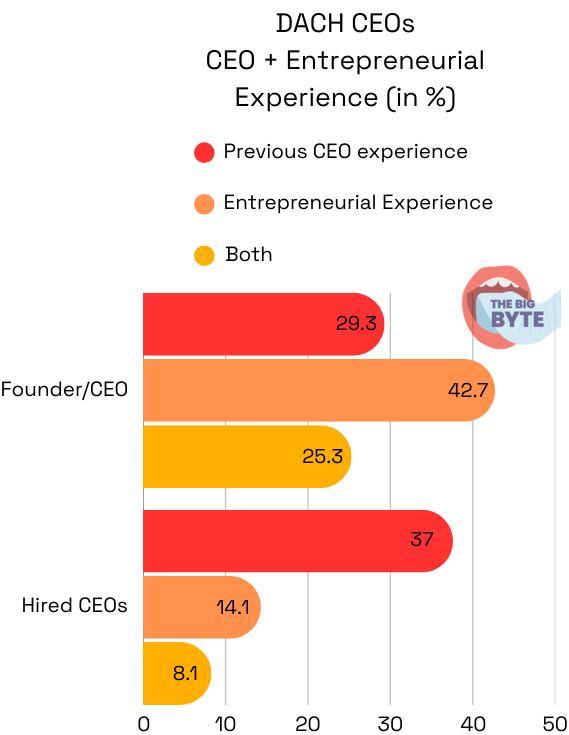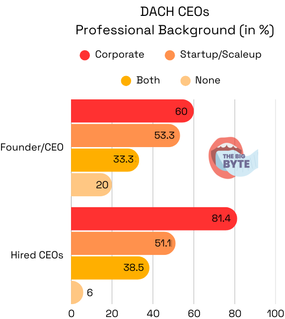 Looking at career-wide experience, 73.8% of CEOs have prior corporate experience, 51.9% have worked in startup or scaleup environments, 36.7% have experience in both, and only 11.% have experience in neither.