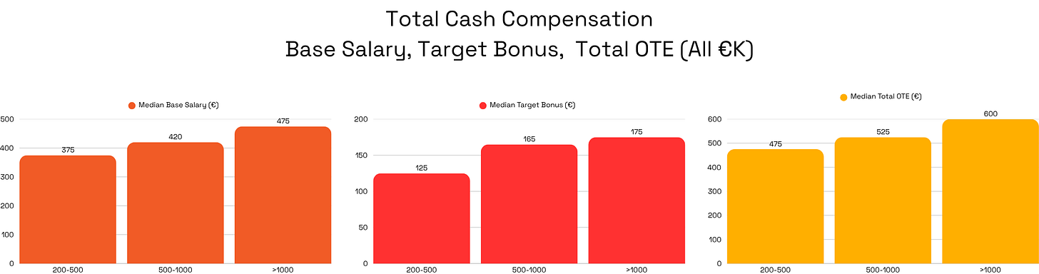 Among scaling companies (200–1,000 FTEs), the median base salary is €387.5K, with €137.5K in bonuses and OTEs of €475K.